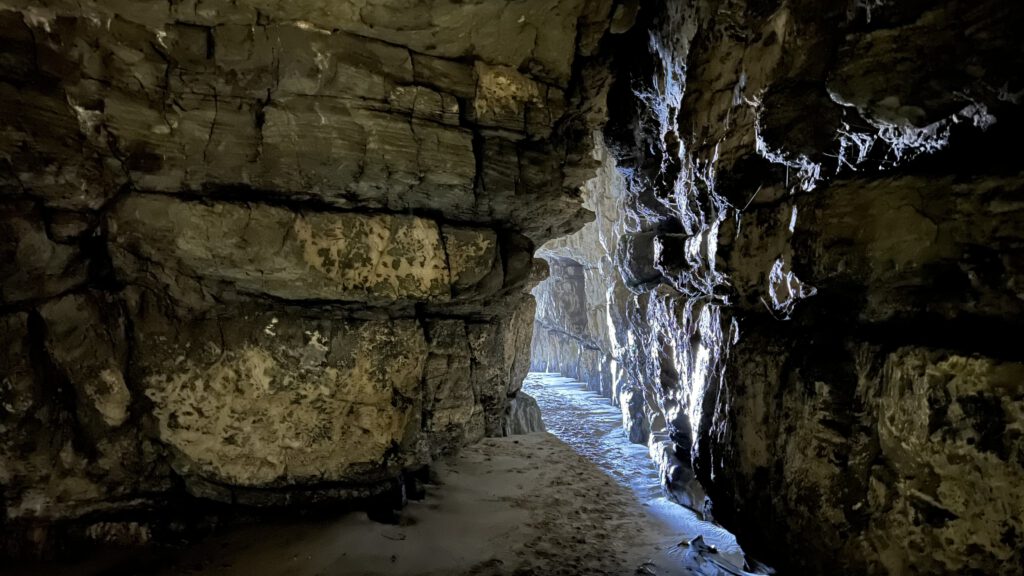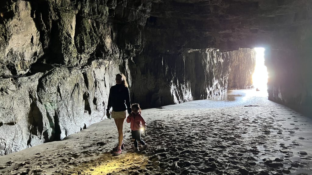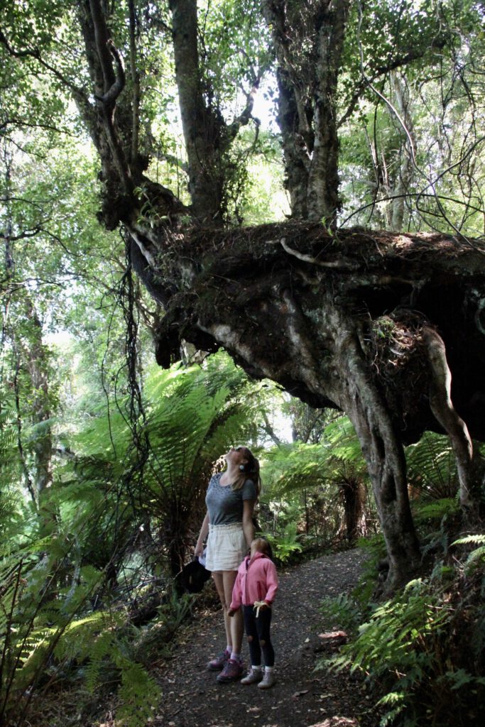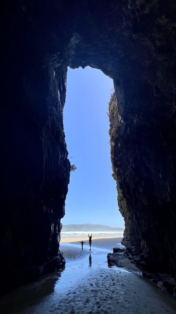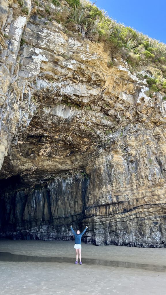 Also starteten wir den schönen Wanderweg durch den Laub- und Farnwald bis zum Meer. Nach einer kurzen Strecke am Strand entlang kamen wir bei den Caves an. Diese sind die größten durch Meerwasser ausgehöhlten Caves der Welt und reichen mehr als 150 Meter in das Gestein. Jetzt wussten wir auch warum sie Cathedral heißen, denn sie haben eine enorme Höhe und werden tagtäglich bei Flut weiter ausgespült. Sehr beeindruckend und mit dem bis ans Meer grenzenden Wald war dieser Ort erneut magisch schön. Wir schafften es pünktlich zum Parkplatz – Nadcha legte einen richtigen Wanderspurt ein – und machten uns im Anschluss auf den Weg zum Campingplatz. Dieser befindet sich in Papatowai und liegt erneut in Strandnähe ohne Strom und Wasser.