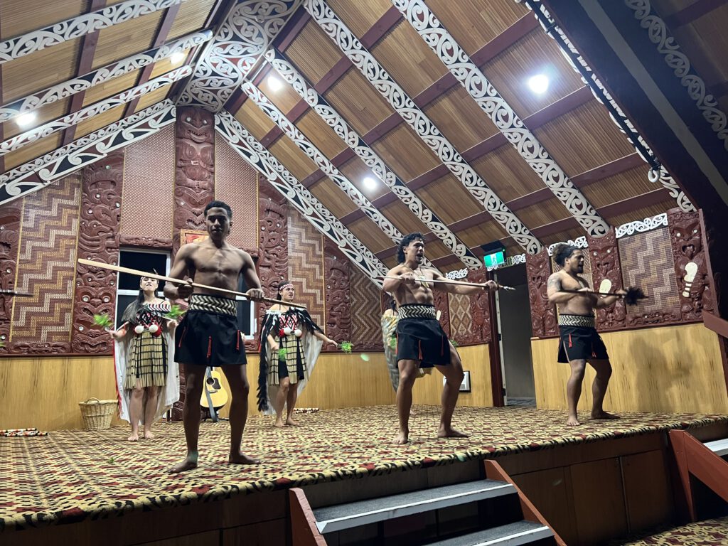 Begleitet von ohrenbetäubenden Muschelfanfaren betrat ein Maori Krieger die Bühne. Sehr angsteinflößend fuchtelte er mit seinem „Taiaha“ – einem Speer – vor Peter herum und machte mit weit aufgerissenen Augen und einer weit rausgestreckten Zunge eine Reihe von Lauten, um dann ein Farnblatt fallen zu lassen. Peter musste dieses nun vorsichtig aufheben, um friedliche Absichten zu symbolisieren. Als dies glücklicherweise geschafft war, ging es zum feierlichen Teil der Veranstaltung über. Es wurden verschiedene wundervoll klingende Lieder der Maori gesungen und dabei getanzt. Die Maori machen während dem Singen viele schnelle und zittrige Bewegungen mit den Händen, da Bewegung für sie Leben bedeutet und die Gesten den Worten mehr Leben verleihen sollen. Ebenfalls wurde das Kämpfen mit dem Taiaha demonstriert. Im Vorfeld hierzu wurde der berühmte Haka der Maori aufgeführt. Mit diesem Tanz – bei dem mit den Füßen ausladend auf den Boden gestampft, die Augen weit aufgerissen und die Zunge weit herausgestreckt und immer wieder mit den flachen Händen auf die Brust gehauen wird – wollte man die Gegner in früheren Zeiten in die Flucht schlagen. Half dies nicht, musste man kämpfen.