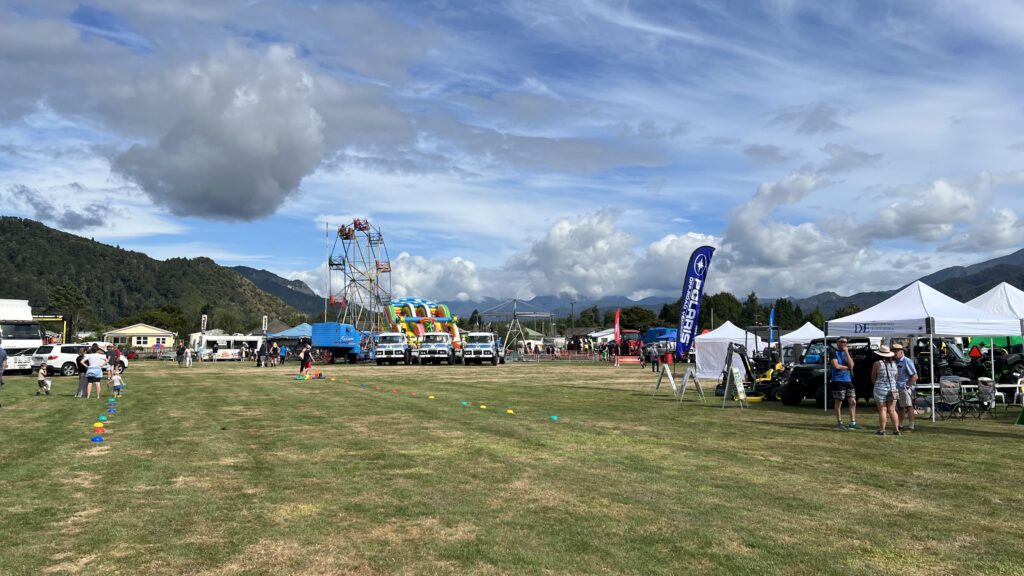 Wie wir hörten, kommen Leute extra aus einem Umkreis von 1:30h für dieses Spektakel nach Murchison gefahren. Denn ausgerechnet an diesem Wochenende ist hier Volksfest und wir das wollten wir uns natürlich nicht entgehen lassen. Zumal wir bis zu unserem Family Rafting Adventure am Nachmittag ohnehin noch jede Menge Zeit hatten. Aber wie stellt man sich ein solches Fest hier in Neuseeland wohl vor? Dudelsackspieler am Eingang? Einen üsseligen Flohmarkt? Ein klappriges Riesenrad mit Dieselgenerator-Antrieb? Eine Traktoren-Ausstellung? Einen Holzfäller- sowie einen Schafscher-Wettbewerb? Richtig. All das gab es hier für uns zu bestaunen und wir wussten garnicht, wo wir anfangen sollten. Diese Entscheidung wurde uns dann von Nadcha abgenommen, die unbedingt auf ein Kettenkarussell, ein Pferdekarusell und eine Hüpfburg wollte. Danach gab es einen Pie zum Mittagessen, welchen wir in einer Scheune zu uns nahmen, in der der hiesige Schafscher-Wettbewerb stattfand.