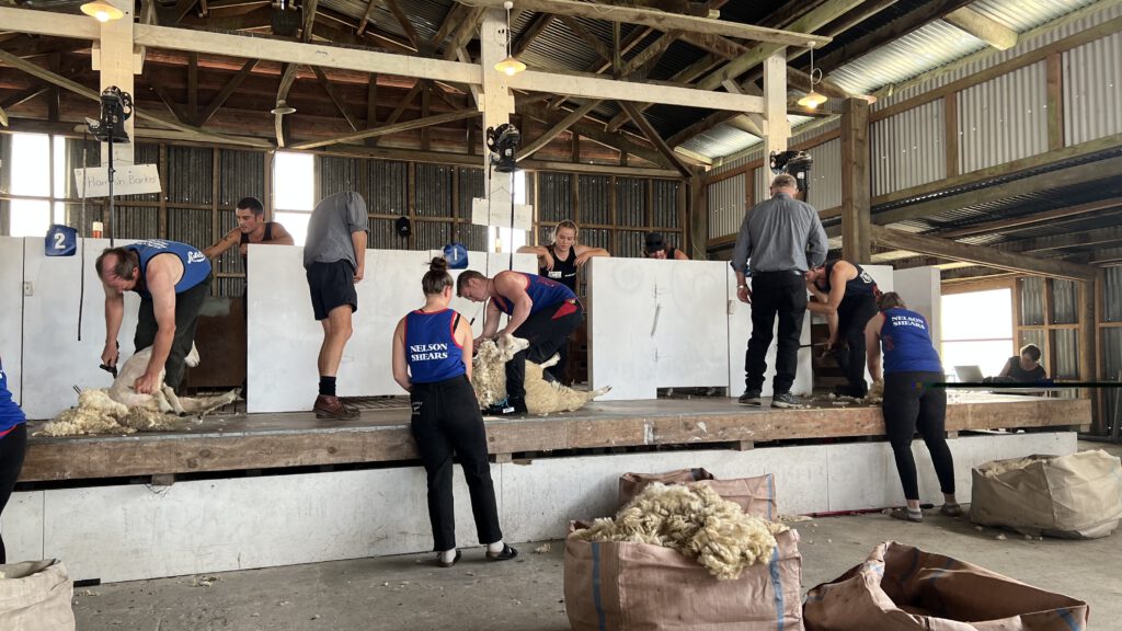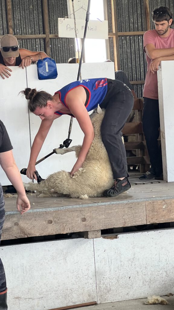 Hier traten in verschiedenen Gruppen die regionalen Profis gegeneinander an. Der Wettkampf war schnell erfasst: Es ging um Zeit – wer am schnellsten drei Schafe schert gewinnt. Dabei wurde allerdings jede/r Schafscherer/in von einem Schiedsrichter beobachtet, der mögliche Schnittverletzungen (cuts) am Schaf zählte, die später als Malus gegengerechnet wurden. Und so ging es im Akkord: Ein wuscheliges Schaf wurde aus einem Gatter auf die Bühne gezerrt und rannte in unter 1:20 Minuten nackig wieder durch einen anderes Gatter von der Bühne runter. Das ganze Treiben wurde von einem Kommentator begleitet, der die Zuschauer wissen ließ, wer vorne lag und wie viele (Schafs-)beine noch zu scheren waren. Das Fazit: Muss man einfach mal erlebt haben.