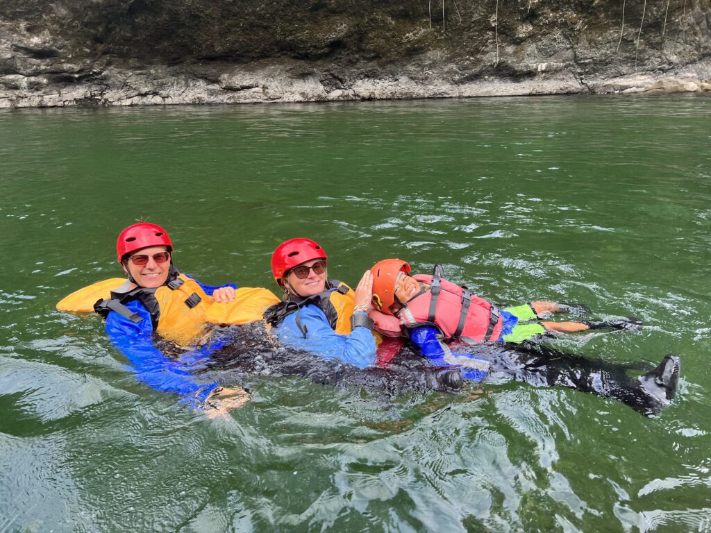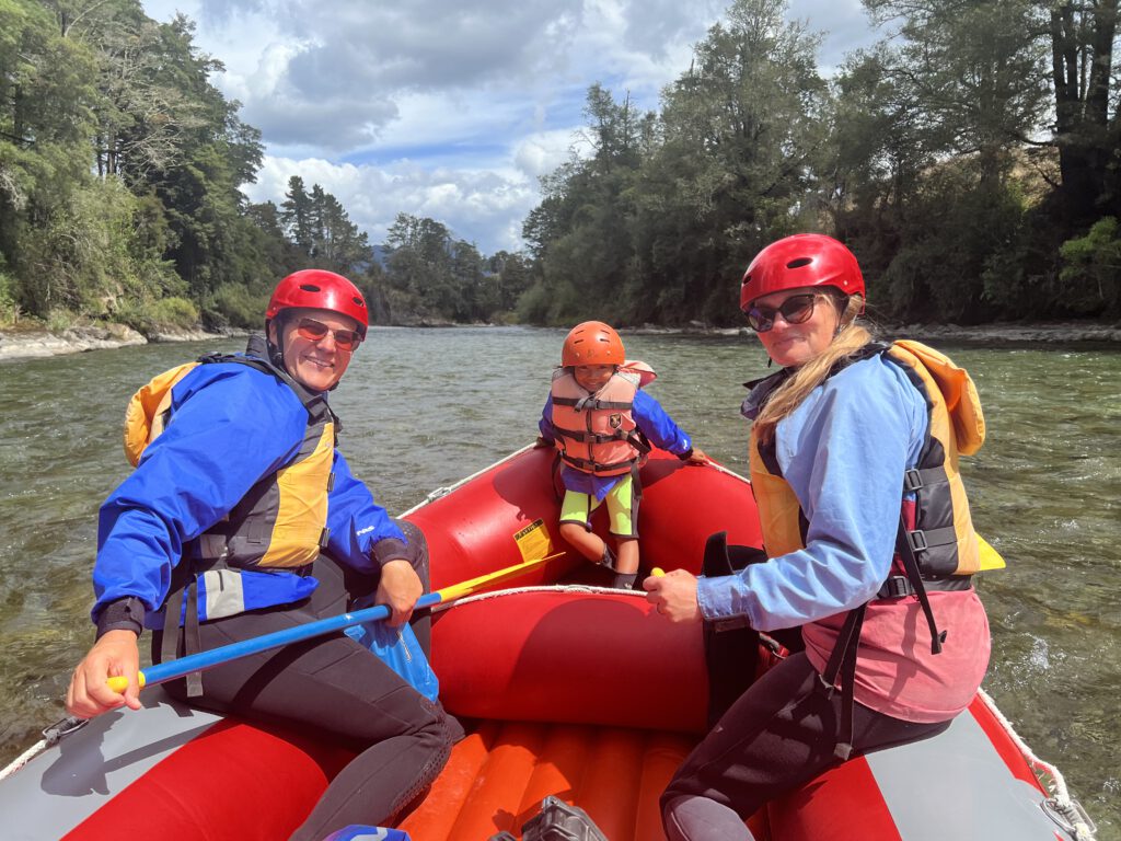 Am Campingplatz angekommen, erhielten wir die freudige Nachricht, dass wir heute beim Familienrafting für uns alleine wären. Shanaya war unsere Guide und nachdem wir mit Neoprenanzügen, Schuhen und Schwimmwesten ausgerüstet waren, ging es auch schon auf die Strecke. Nach 15 Minuten Fahrt mit einem kleinen Bus hatten wir unseren Einstig in den Grade 2 Fluss erreicht, der uns in ca. 2 Stunden wieder zurück an den Campingplatz bringen sollte. Die ersten Stromschnellen ließen nicht lange auf sich warten und Nadcha ganz vorne im Schlauchboot freute sich riesig als wir hindurch steuerten, um gleich darauf (absichtlich) frontal in einen Felsen zu rumsen. So ging das Spiel weiter. Stromschnellen, Anlauf, Crash. Nach einiger Zeit war uns so warm in den Anzügen, dass wir eine Abkühlung gut gebrauchen konnten. Shanaya ließ uns dieses Mal vor kleinen Stromschnellen aus dem Schlauchboot steigen, so dass wir auf dem Rücken mit den Beinen zuerst hindurch treiben konnten. Auch hier lachte Nadcha sich die ganze Zeit kaputt. Gekrönt wurde unsere Tour mit dem obligatorischen Sprung von einem Felsen. Nadcha traute sich dabei von einem kleinen 2m hohen Felsen in den tiefen Fluss zu springen und das sogar ganz ohne Taucherbrille. Danach ging es für den letzten Abschnitt zurück in unser Raft und wir konnten uns während der Fahrt sogar noch in der Sonne trocknen lassen. Als wir dann in der Ferne den Campingplatz sahen, freuten wir uns bereits auf eine heiße Dusche und einen Kaffe bzw. Kakao.