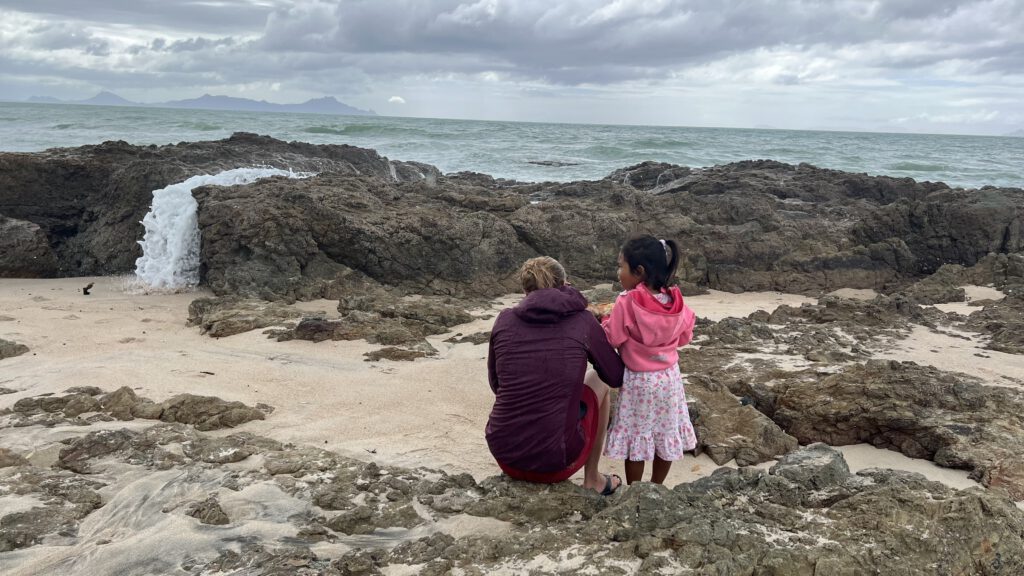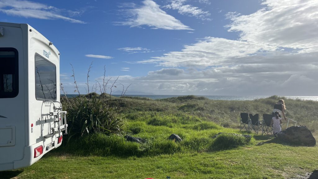 Erst um 11:30 Uhr verliessen wir diesen wundervollen Campingplatz, kauften bei unserem Pie-Stand des Vertrauens in Mangawhei ein, und fuhren bis Langs Beach. Auf einigen Felsen am Strand suchten wir uns ein Plätzchen und liessen uns die Pies schmecken, immer das Wasser im Blick. Denn die Flut war im Anmarsch und das zügig. Immer wieder bekamen wir ein paar Meerwasser-Spritzer von den aufschlagenden Wellen ab und Nadcha informierte uns im Sekunden-Takt bis wohin das Wasser mittlerweile stand. Dann setze Regen ein und wir verschwanden in unserem Camper. Nadcha hatte ihr Mittagessen noch nicht verdrückt, da waren die Felsen, auf denen wir eben noch Platz genommen hatten, bereits vom Wasser umspült. Super, dass unser Camper über so große Fenster verfügt, denn so hatten wir auch vom Esstisch alles im Blick.