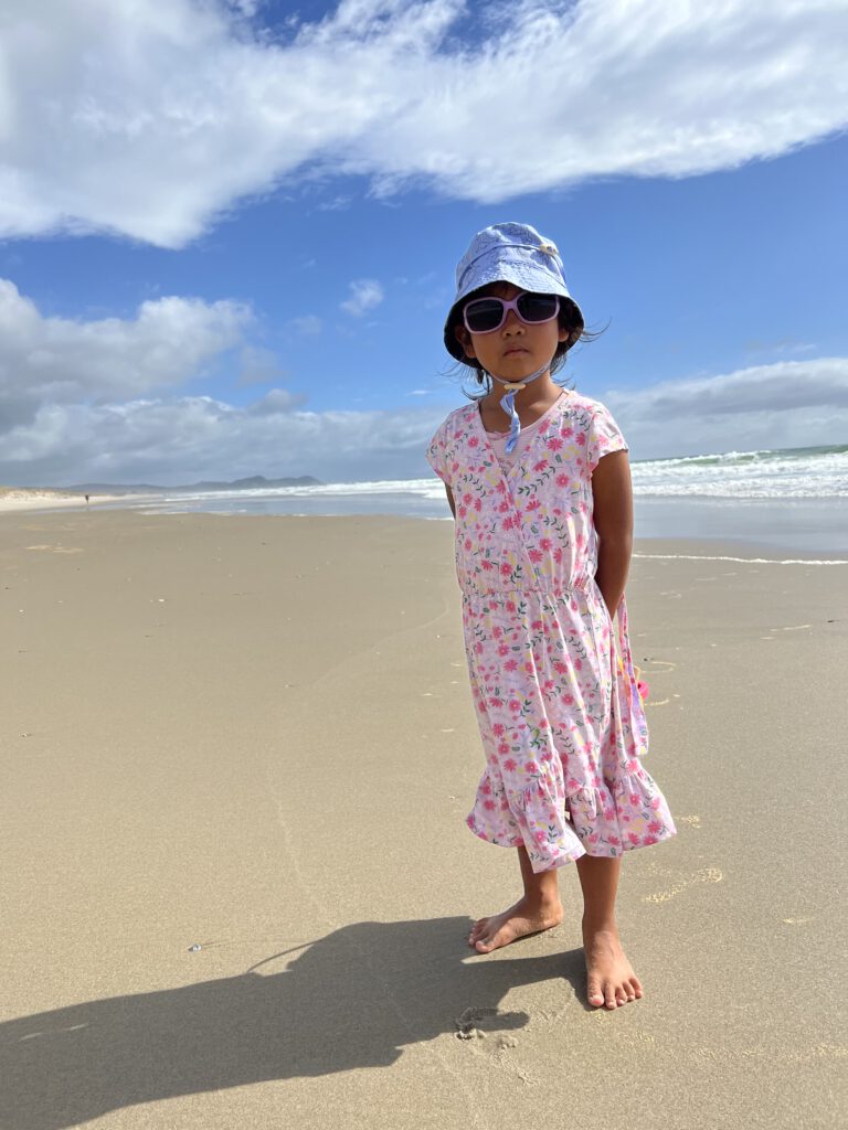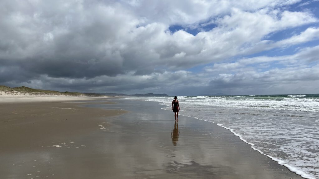 Anders als vorausgesagt, strahlte die Sonne heute Morgen vom Himmel. Wir packten daher unsere Campingstühle aus und richteten diese perfekt Richtung Sonne und Meer aus. Mit diesem Ausblick liessen wir uns unseren Kaffee und Tee schmecken – was für ein Start in den Tag. Auch für einen ausgiebigen Strandspaziergang nutzten wir das schöne Wetter, denn wer weiß schon, ob und wann dieses umschlägt. Ich liess es mir außerdem nicht nehmen, in die Wellen zu springen an diesem endlosen, menschenleeren Strand.